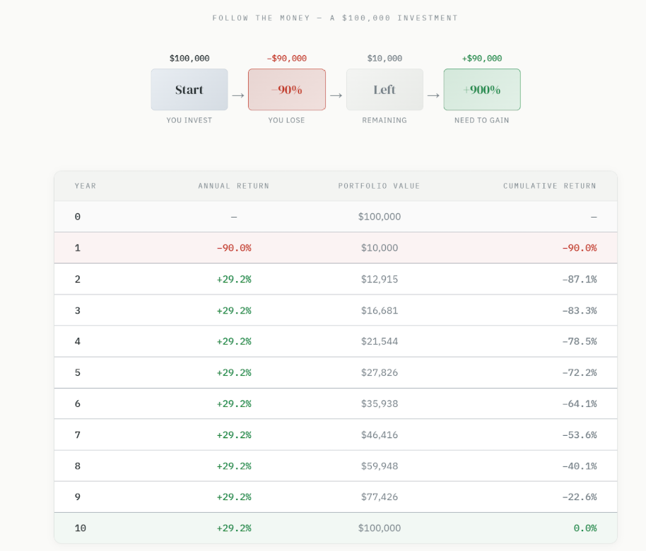 An investor who loses 90% on an investment needs to earn a whopping 900% on future investments just to break-even.